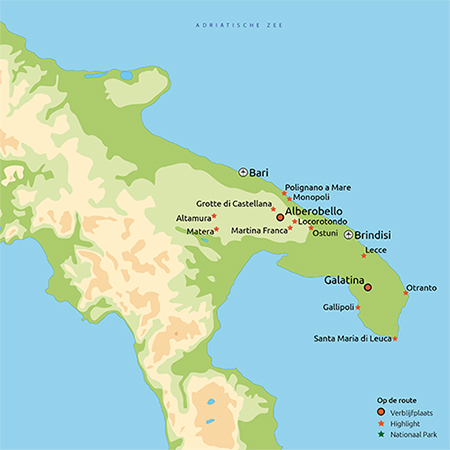 De dag begint met een bezoek aan Bari, de hoofdstad van Puglia. Het centrum bestaat uit twee contrasterende delen: een sfeervolle oude stad met kronkelende straatjes en een nieuwe stad met elegant aangelegde commerciële wijken en fijne boetiekjes. De haven, bijgenaamd de ‘Gateway to the Oriënt’, is een belangrijk doorvoerpunt voor goederen uit het Middellandse Zeegebied. Vervolgens rijden we verder naar Monopoli, ook wel ‘het best bewaarde geheim van Italië’ genoemd. Het oude centrum is een wirwar van straten en de charmante vissershaven met kleurrijke boten steekt mooi af tegen de oude crèmekleurige panden op de kade. Aan het einde van de dag rijden we terug naar ons hotel in Alberobello.